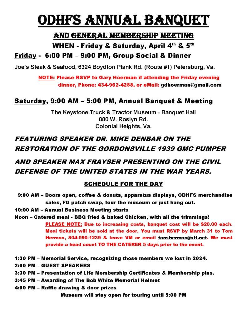Our Annual Meeting and Banquet is coming up on April 5th! Be sure to let Gary know if you plan to attend the group dinner on Friday night at Joe’s in Petersburg, and Tommy needs to know if you plan to attend the meeting on Saturday April 5th for the caterers head count! Details in the flyers below.